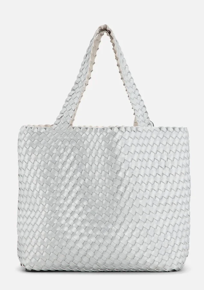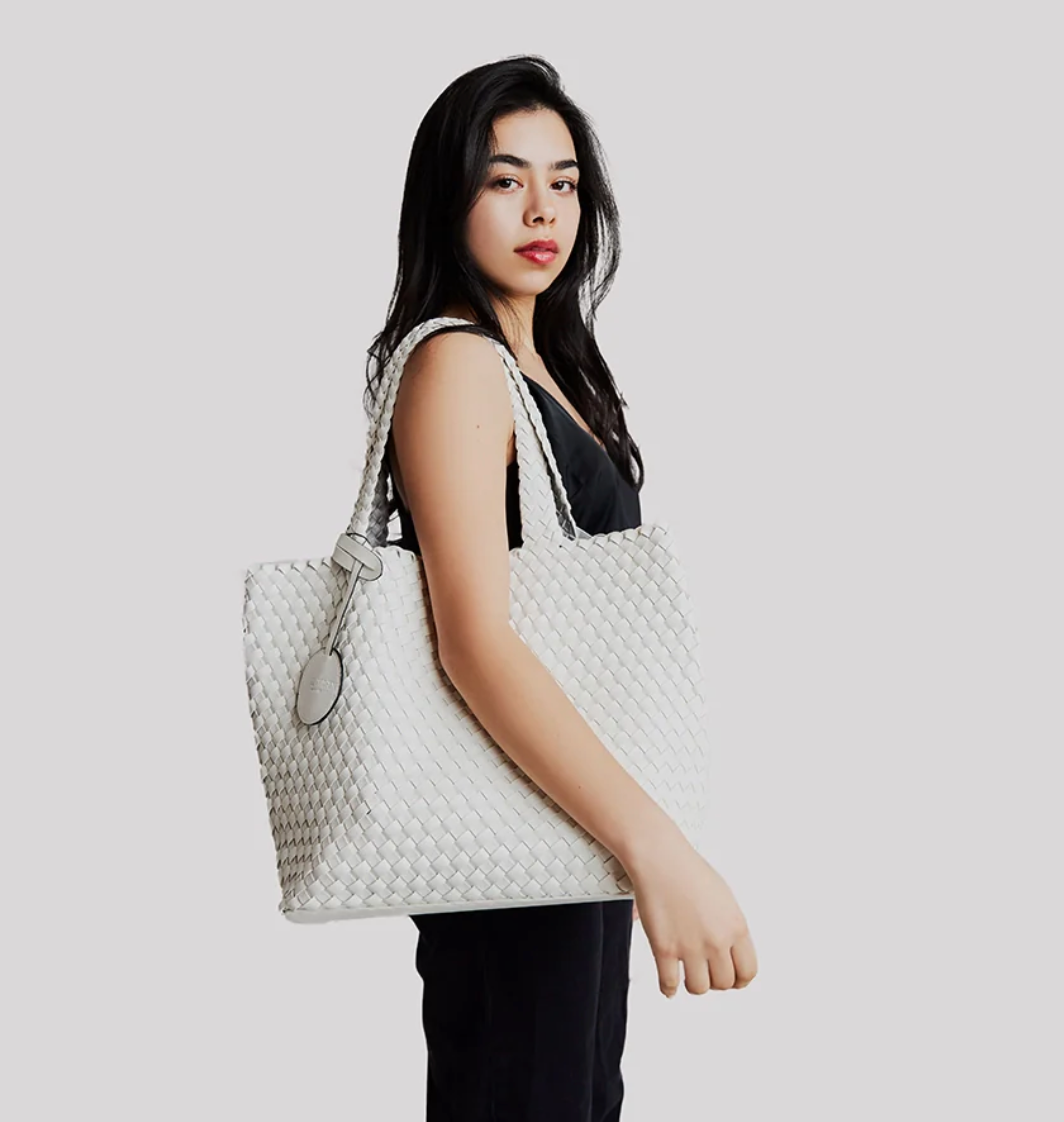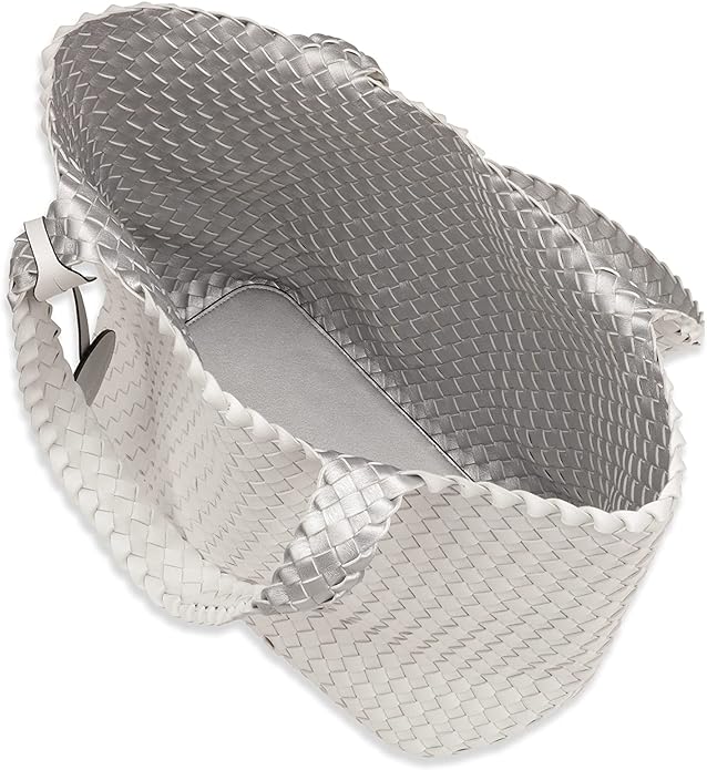 The bag is made of braided soft faux-leather and offers double styling options as it is reversible. The bag features handles and a removable shoulder strap and a logo tag with hidden snap hook attach your wallet or keys to secure them from getting lost at the bottom of your bag.