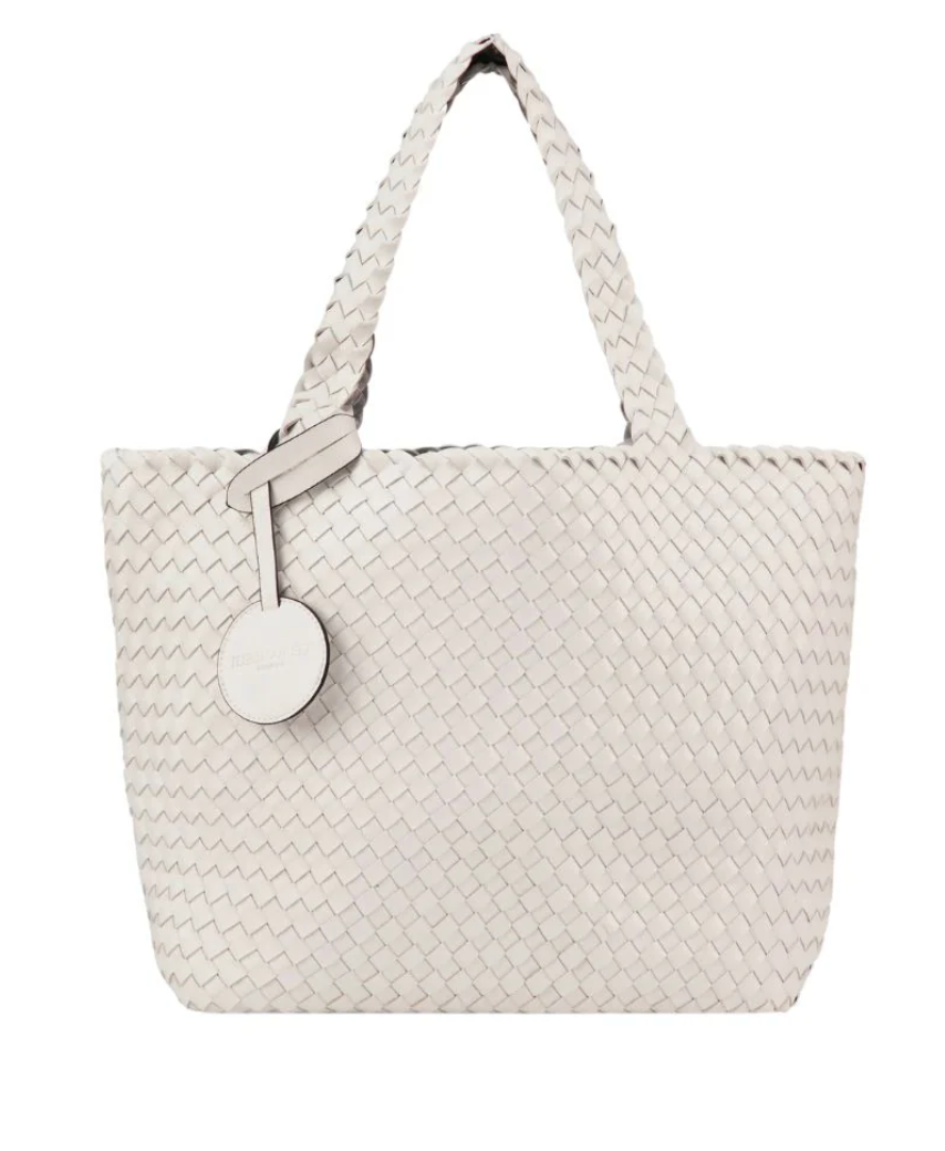 The bag is made of braided soft faux-leather and offers double styling options as it is reversible. The bag features handles and a removable shoulder strap and a logo tag with hidden snap hook attach your wallet or keys to secure them from getting lost at the bottom of your bag.