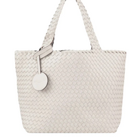 The bag is made of braided soft faux-leather and offers double styling options as it is reversible. The bag features handles and a removable shoulder strap and a logo tag with hidden snap hook attach your wallet or keys to secure them from getting lost at the bottom of your bag.
