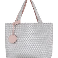 The bag is made of braided soft faux-leather and offers double styling options as it is reversible. The bag features handles and a removable shoulder strap and a logo tag with hidden snap hook attach your wallet or keys to secure them from getting lost at the bottom of your bag.