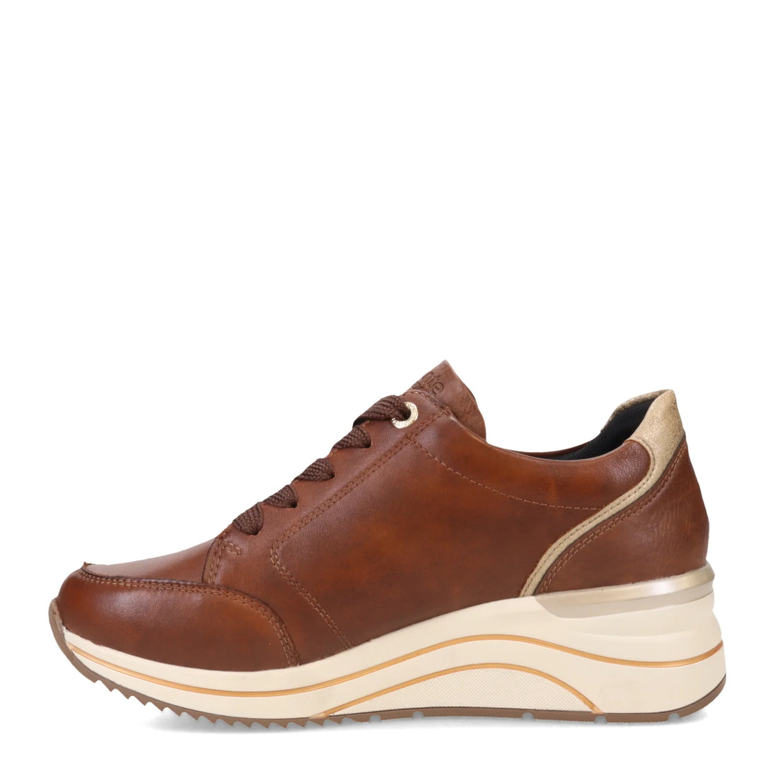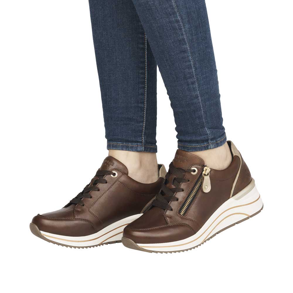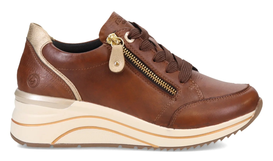 This trendy wedge sneaker is made with buttery soft leather uppers and a classic lace-up front for adjustability. A contrasting white wedge and gold accents set this sneaker apart from the rest. The D0T03 also has a comfortable Light 'n Soft removable insole & a side zipper to aid with on/off. Turn heads in comfort with the D0T03 wedge sneaker from Remonte by Rieker.